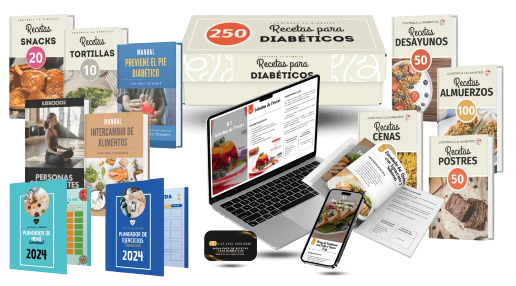 Cuatro libros con mas de 250 recetas + 20 Recetas de Snacks + 10 Recetas de Tortillas + Manual para Prevenir el Pie Diabéticos + Ejercicios para Personas con Diabetes + Manual para Intercambio de Alimentos + Planeador de Menú y Ejercicios